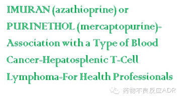 加拿大卫生部于2014年3月26日公布信息,硫唑嘌呤或巯嘌呤与肝脾T细胞淋巴瘤有关。肝脾T细胞淋巴瘤(HSTCL)是一种稀有、恶性水平和致死率都较高的疾病。现已有单独应用硫唑嘌呤或巯嘌呤治疗炎性肠病(IBD)的患者产生HSTCL的报道。截至2013年11月30日,加拿大已发明2例应用巯嘌呤者出现HSTCL,4例应用硫唑嘌呤者出现HSTCL。