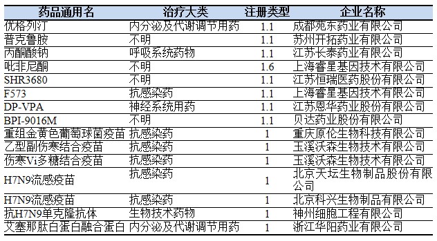注册分类为1类的新药申报均为新药临床申请,其中,化学药品有8个品种,生物制品有6个品种。生物制品中有4个品种均为疫苗,针对H7N9,共有2个疫苗和1个治疗用抗体药物、体现了国内制药企业针对流行病学而开展新药研发的及时性。